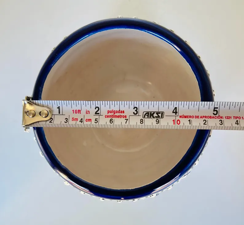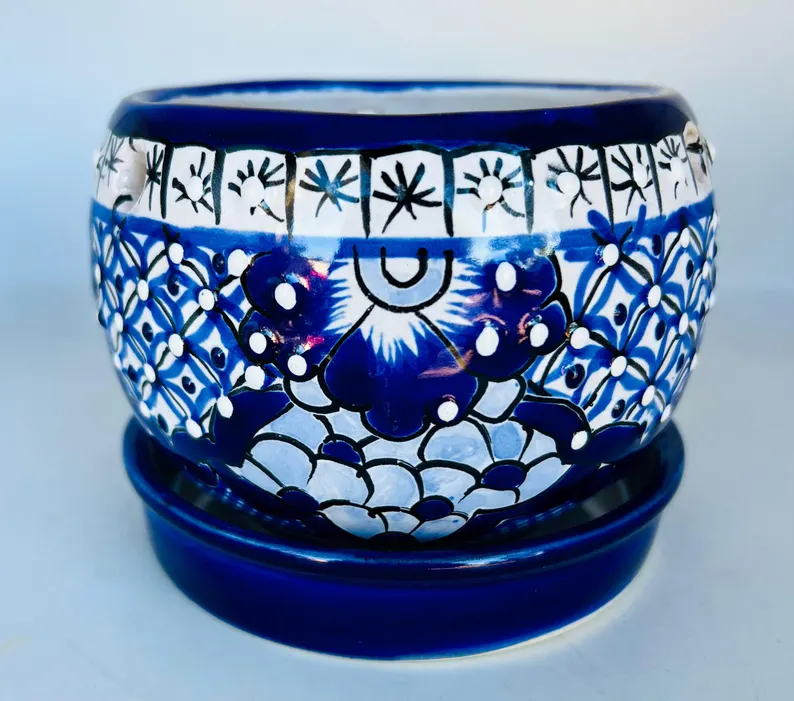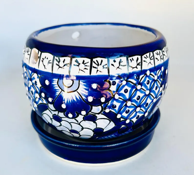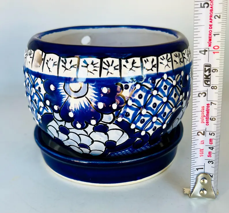Bring a touch of authentic Mexican artistry to your home with this stunning hand-painted blue Talavera planter. Featuring intricate floral designs in rich cobalt tones, this piece is crafted by skilled artisans and comes with a matching saucer—perfect for indoor plants, succulents, or as a decorative accent.