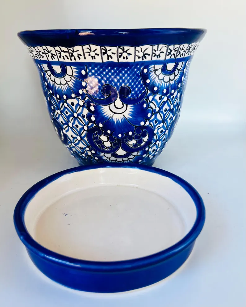 This beautiful hand-painted cobalt blue and white Talavera flower pot is a timeless piece of Mexican artistry. Each piece is carefully crafted and painted by skilled artisans, making it truly one of a kind.