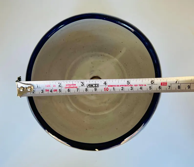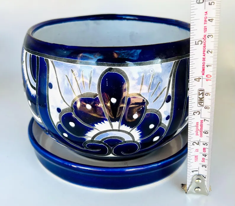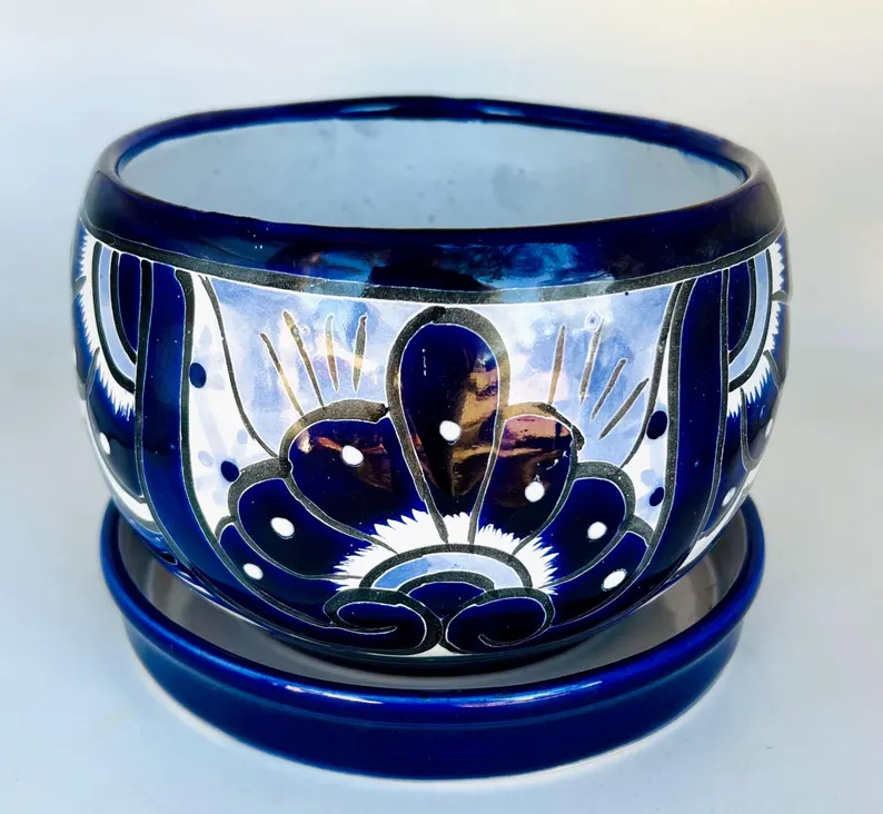This beautiful hand-painted cobalt blue and white Talavera flower pot is a timeless piece of Mexican artistry. Each piece is carefully crafted and painted by skilled artisans, making it truly one of a kind.