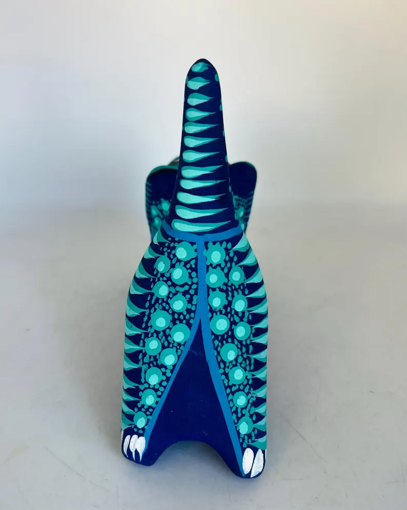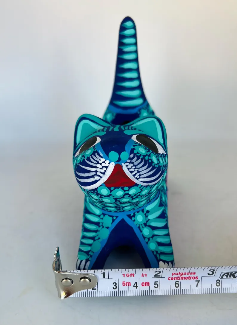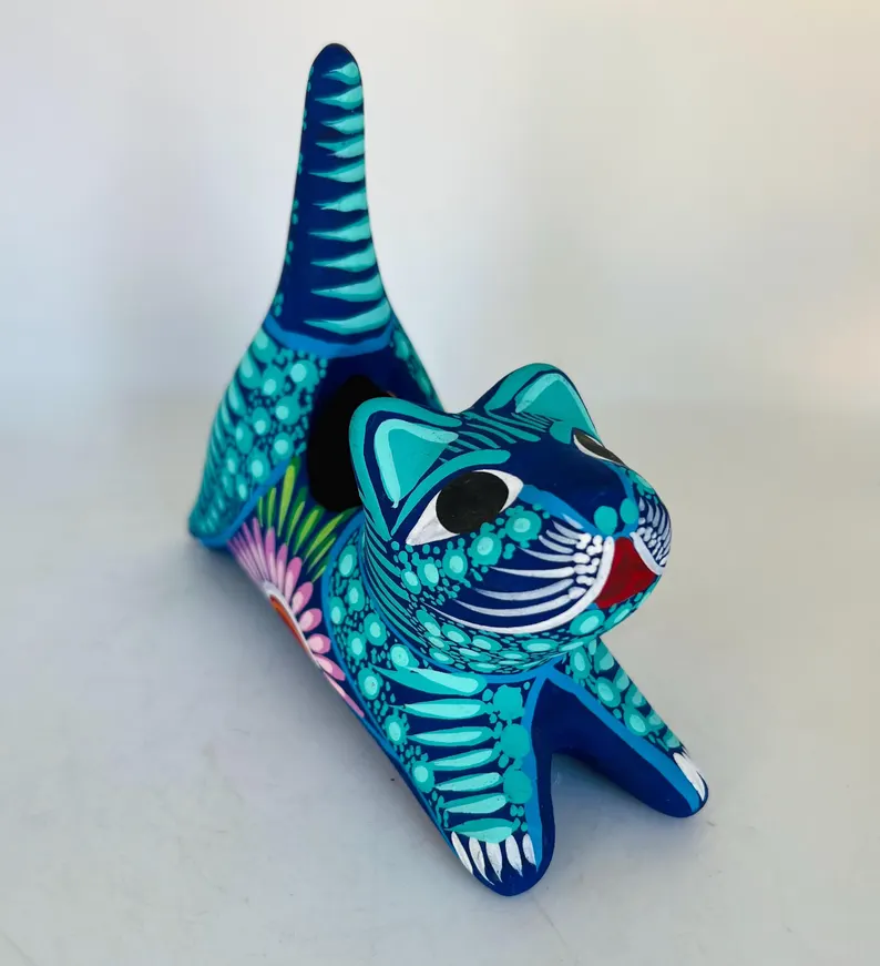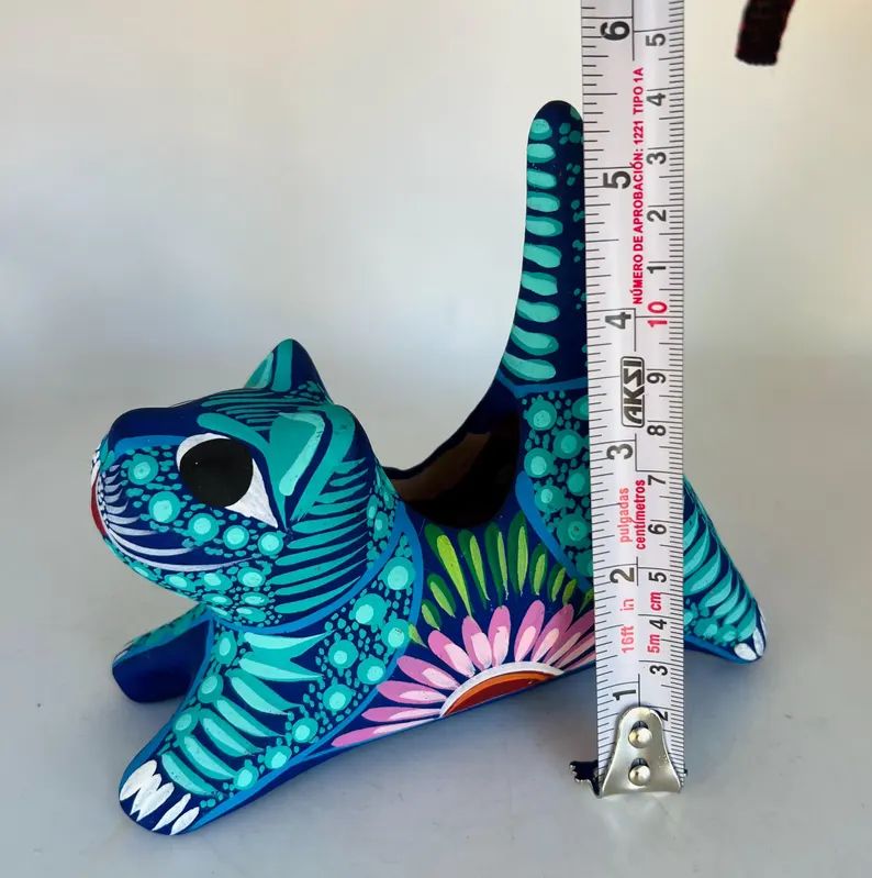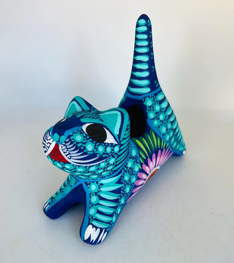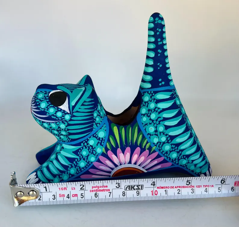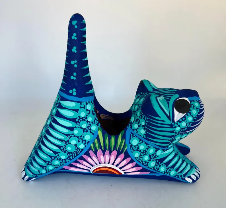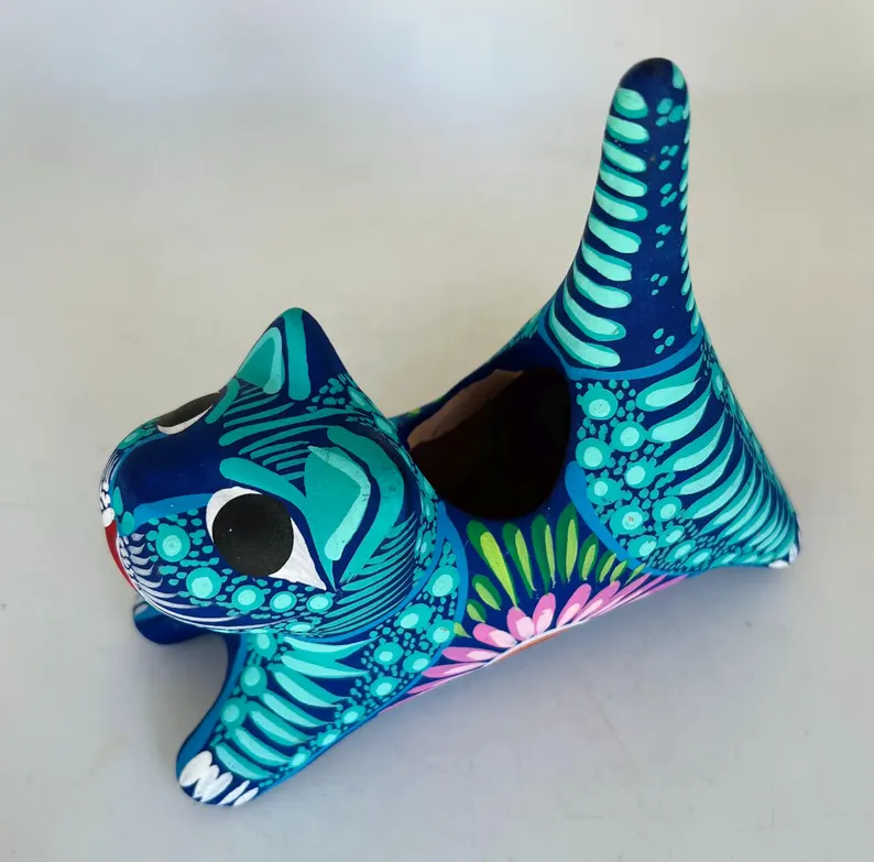 Bring color and charm to your space with this hand-painted Mexican folk art flower pot, beautifully shaped like a playful cat. Bursting with vibrant turquoise, deep blue, and intricate floral details, this unique piece is a true celebration of traditional craftsmanship.
