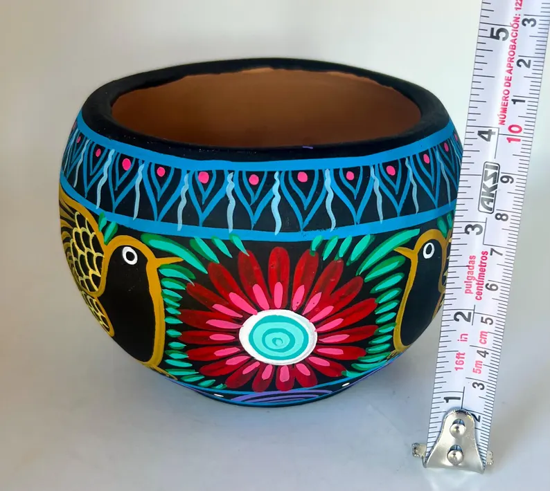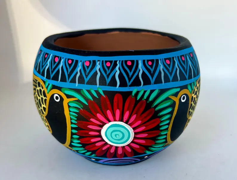 Bring vibrant Mexican folk art into your home with this beautiful hand-painted ceramic flower pot. Featuring bold colors, intricate floral details, and charming bird motifs, this piece is a true celebration of traditional Mexican craftsmanship.