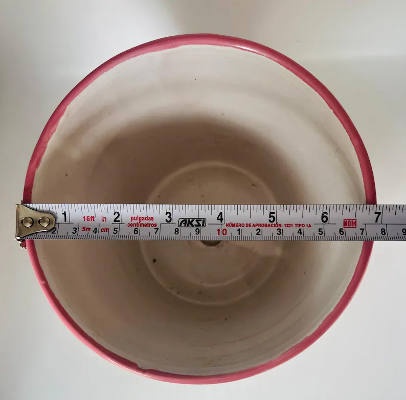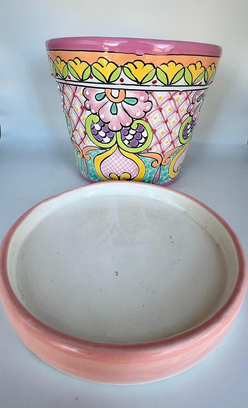 This vibrant hand-painted Mexican ceramic pot is a true celebration of color and craftsmanship. Featuring soft pinks, sunny yellows, fresh greens, and delicate floral and geometric details.