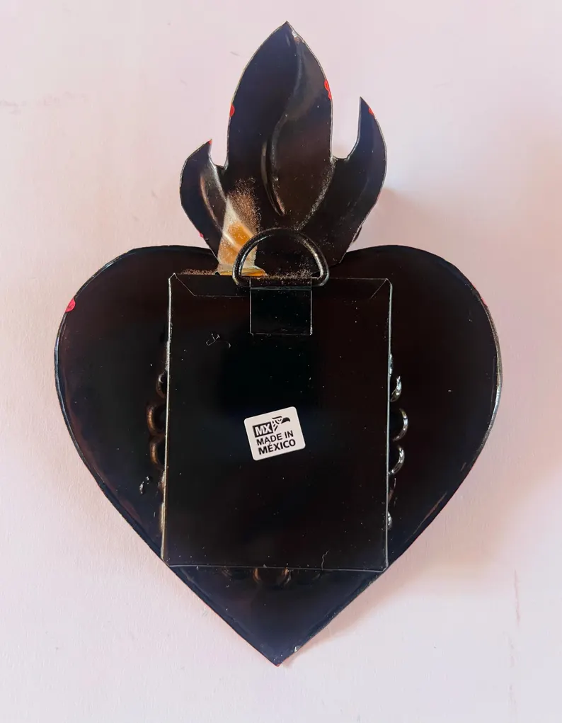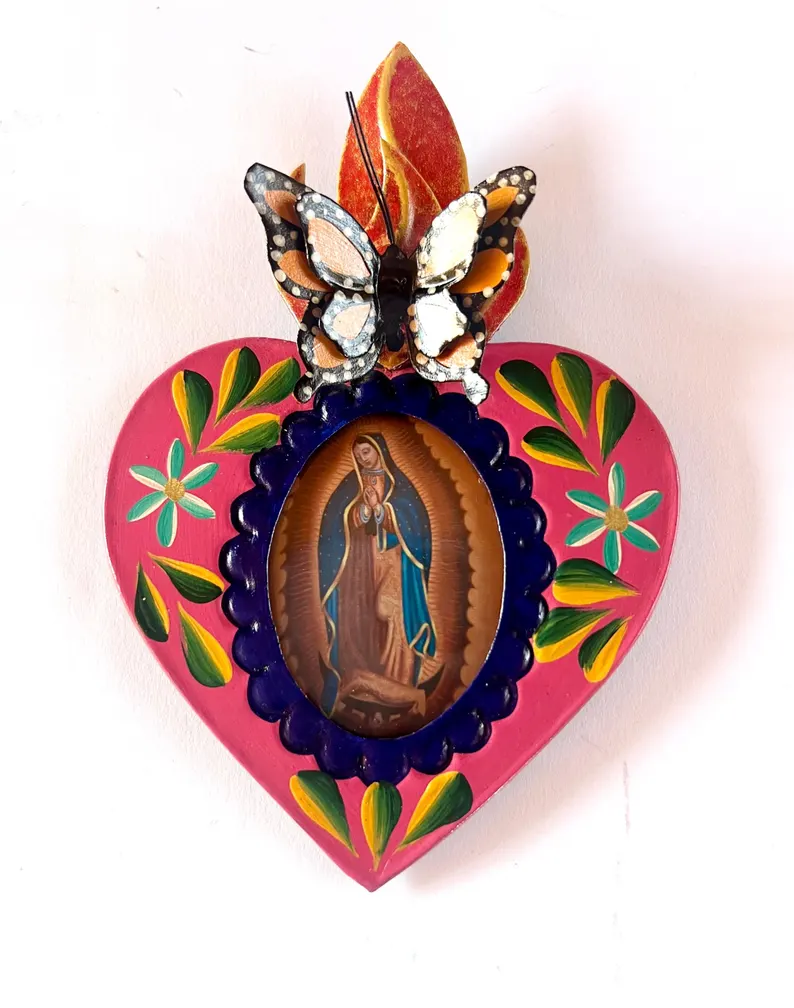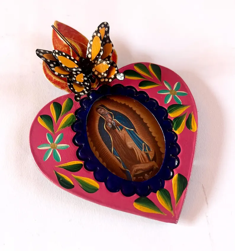 Beautiful and Unique Tin Mexican Heart Nicho with Virgin Guadalupe on it.