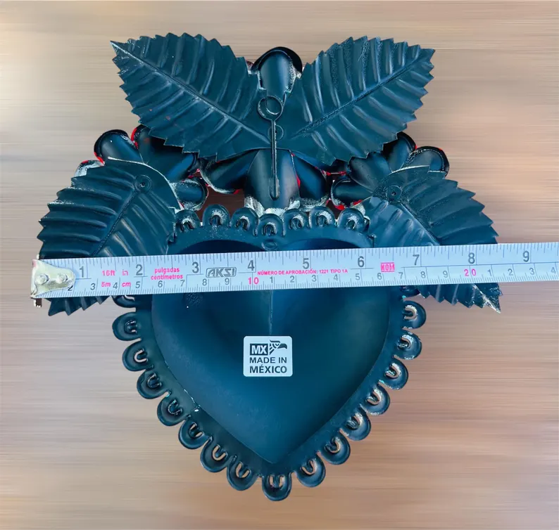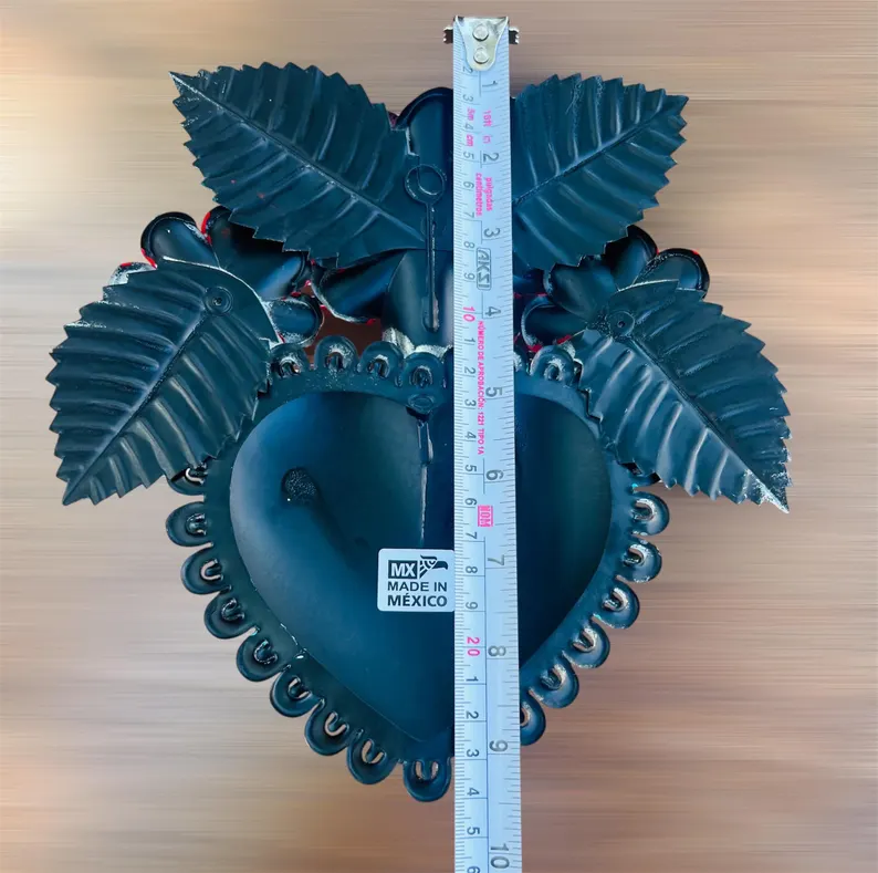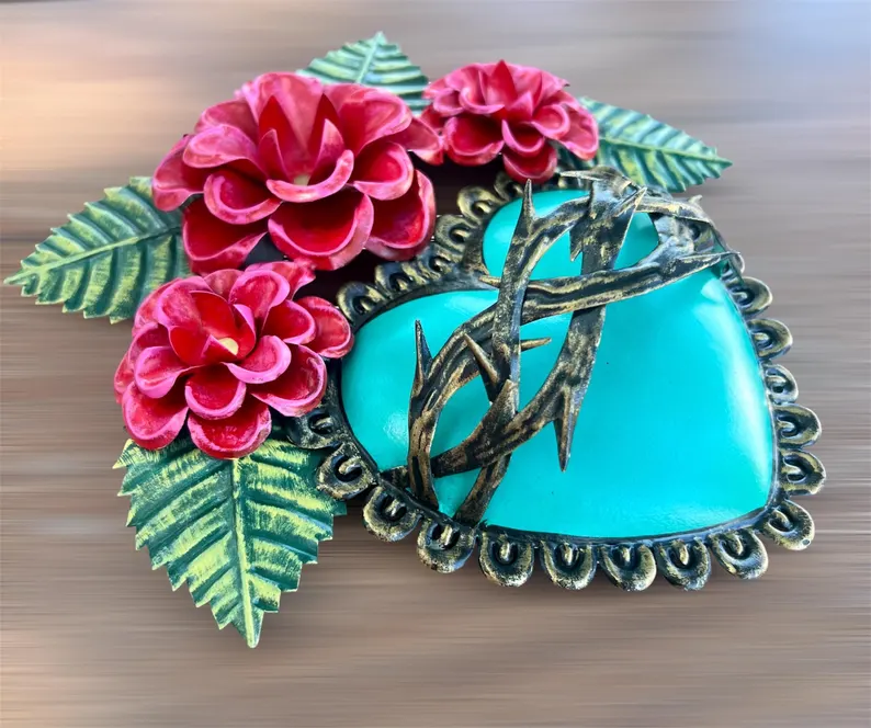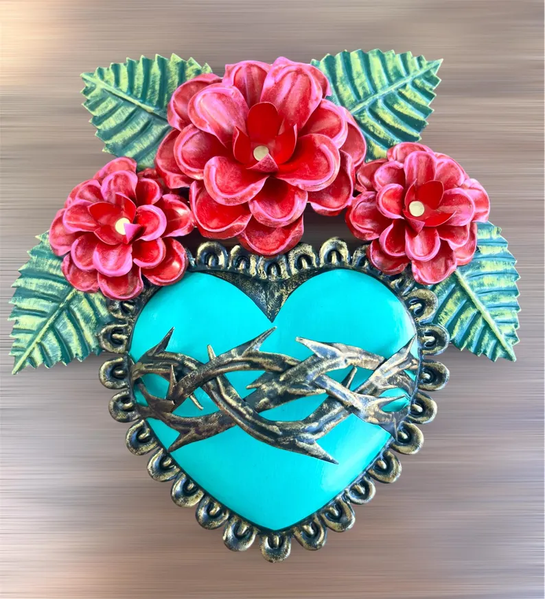 Beautiful Turquoise Tin Heart with flowers and thorns